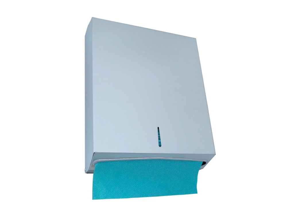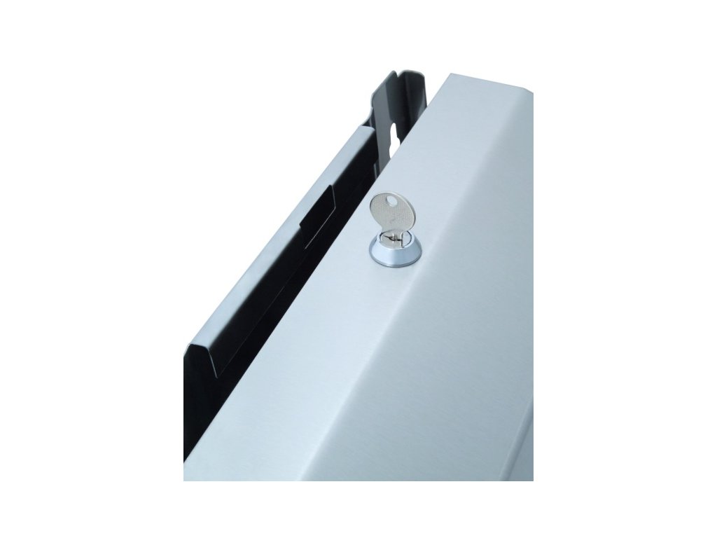 Dávkovač skládaných papírových ručníků, zamykatelný, kapacita 400 ks, matovaný nerez, rozměry 360 mm výška × 280 mm šířka × 120 mm hloubka, hmotnost 2,3 kgDoplňkové parametry