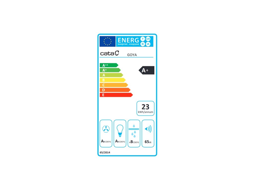 Bezkartáčový (brushless) motor CATA BTDCA je konstruovaný tak, aby eliminoval v maximální míře vnitřní tření (tím, že neobsahuje uhlíkové kartáče) a tak dosahoval maximálních výkonů při nízké hlučnosti a nízké spotřebě elektrické energie. Zároveň tím, že nepoužívá uhlíkové kartáče a ty tak není potřeba pravidelně měnit, zvyšuje se životnost motoru a tím i celé digestoře. Digestoř CATA GOYA je unikátní kombinací obvodového a spodního sání (při zaklopené čelní desce odsává přes tukový filtr ve spodní části digestoře) Komínová ke zdi, 900 mm, nerez/bílé sklo, dotykové (senzorové) ovládání TC Slider, 1 motor BTDCA 130 W, 4+1 rychlostí, 820 m³/h (5 Pa), max. hlučnost Lw 65 dB(A), max. tlak 375 Pa, 15 min. časovač, LED pásek s nastavitelnou intenzitou jasuDoplňkové parametry