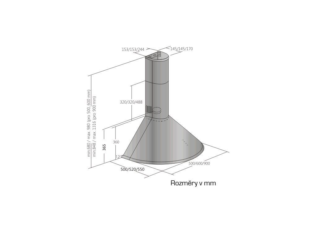 Komínová digestoř ke zdi, šíře 50 cm, nerez, max. výkon 434 m3/h (15 Pa), hlučnost Lw 52 – 69 dB(A), 3 rychlosti, odsávací jednotky mají individuálně vyvažovanou turbínu, motory jsou opatřené vratnými tepelnými pojistkami (při přetížení motoru vypne, po jeho vychladnutí opět sepne), mechanické tlačítkové ovládání, kovové sendvičové tukové filtry, které lze mýt v myčce, možnost práce v odtahovém i recirkulačním režimu, výstupní průměr 120 mm, Výbava: úsporné LED osvětlení 2 × 4 W, zdarma zpětná klapkaDoplňkové parametry