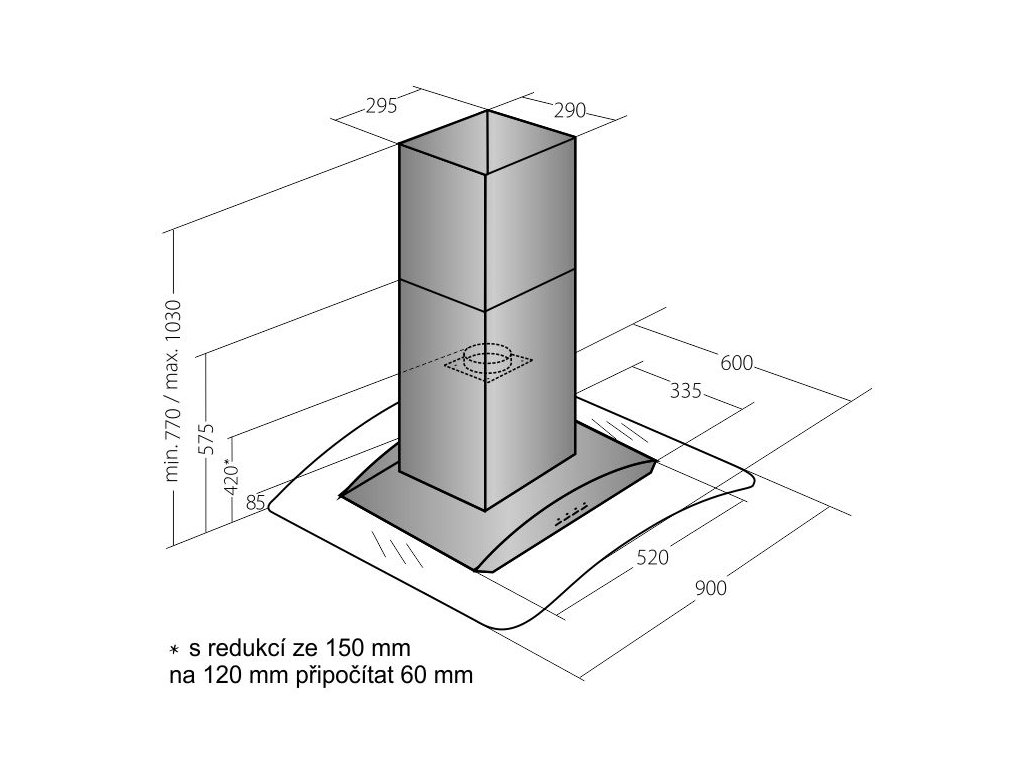 Ostrůvková digestoř, šíře 90 cm, nerez / tónované sklo, max. výkon 822 m³/h (5 Pa), hlučnost Lw 51 – 69 dB(A), 3 rychlosti + TURBO, odsávací jednotky mají individuálně vyvažovanou turbínu, motory jsou opatřené vratnými tepelnými pojistkami (při přetížení motoru vypne, po jeho vychladnutí opět sepne), kovové sendvičové tukové filtry, které lze mýt v myčce, výstupní průměr 150 mm, možnost práce v odtahovém i recirkulačním režimu, VIP výbava: úsporné LED osvětlení 4 × 2 W, elektronické dotykové ovládání s doběhovým časovačem, zdarma dálkový ovladač i s bateriemi, zdarma redukce na 120 mm a zpětná klapka, Benefity: používání dálkového ovládání usnadňuje údržbu digestoře (méně otisků na digestoři = snazší čištění), ovladač je opatřený magnetem, lze jej přichytit třeba na dveře lednice (může být snadno po ruce, nikam nezapadne)Doplňkové parametry