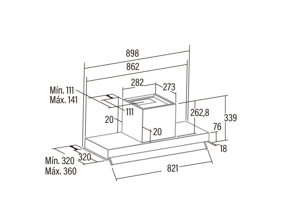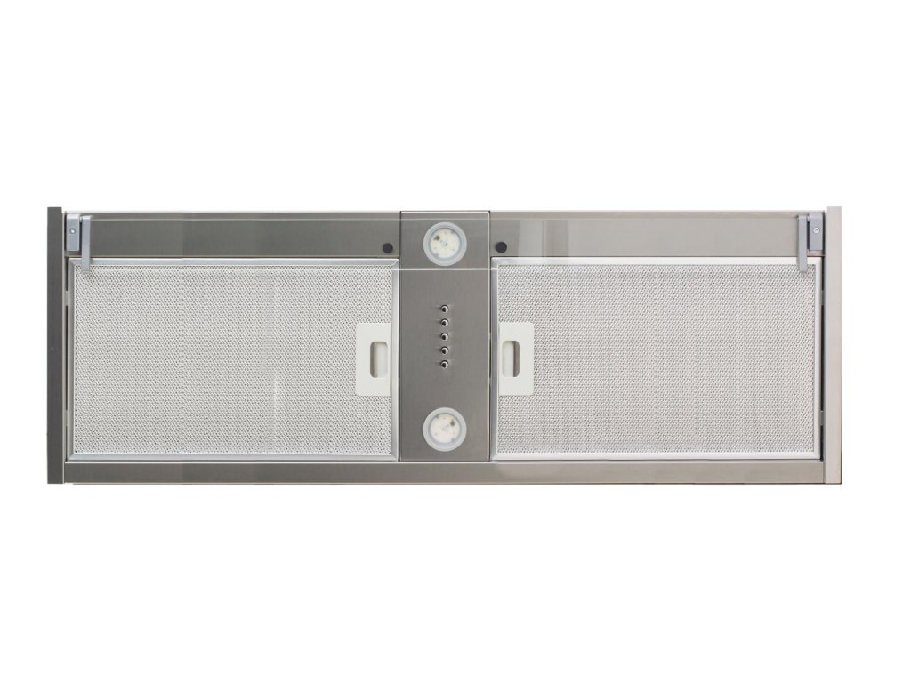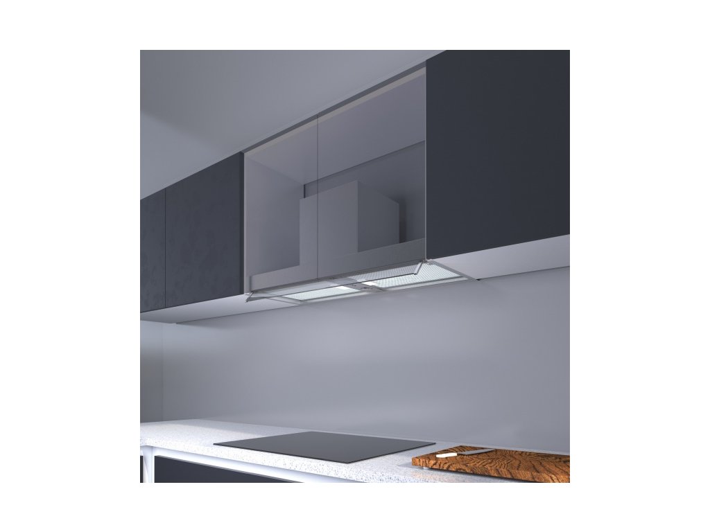 Neviditelná vestavná digestoř, 900 mm, nerez / sklo, mechanické tlačítkové ovládání, 3 rychlosti, max. výkon 645 m³/h (5 Pa), hlučnost Lw 56 – 70 dB(A), max. tlak 430 Pa, kovové sendvičové tukové filtry, které lze mýt v myčce, výstupní průměr 150 mm, možnost práce v odtahovém i recirkulačním režimu, snadná montáž, Výbava: úsporné LED osvětlení 2 × 4 W, výklopné skleněné stínítko pro zvětšení plochy odsávání a pro ochranu dvířek skříňky. Recirkulační režim u vestavných digestoří: Digestoř se osadí uhlíkovým pachovým filtrem. Přefiltrovaný vzduch se z digestoře odvádí obdobně jako u odtahového režimu trubkou, která prochází celou skříňkou. Tato trubka však neústí kolenem do zdi, ale nad skříňku, kde ji doporučujeme zakončit mřížkou. Pro výrobu skříňky je směrodatný rozměrový nákres a údaje v něm uvedené. Fotografie digestoří jsou ilustrační.Doplňkové parametry