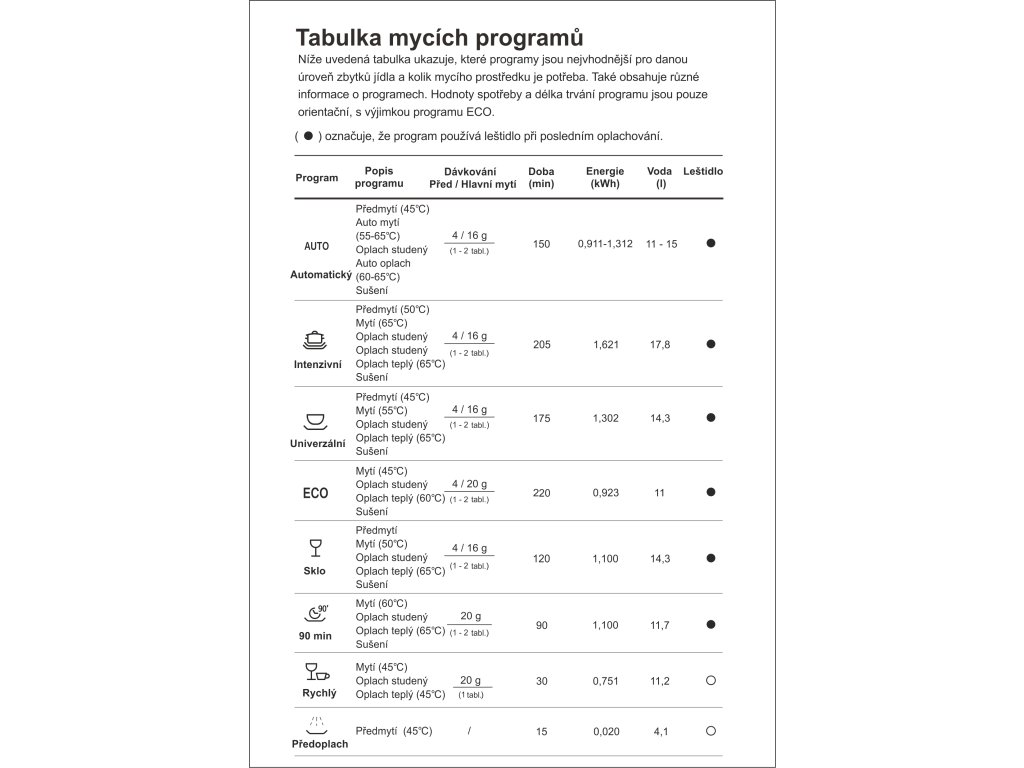 Vestavná myčka nádobí – Možnost vlastního panelu dveří 14 sad nádobí – Automatický program Energetická třída E – Šířka 60 cm LED displej – Nízkozdvihová tlačítka, elektronické ovládání 8 programů: Intenzivní 65ºC – Normální 55ºC – ECO 45ºC – Expresní 90 min 60ºC – Sklo 50ºC – Rychlý 30 min 45ºC – Automatický 55ºC Indikátor doplnění soli – Indikátor doplnění leštidla Odložený start 3/6/9 hodin – Ukazatel zbývajícího času – Spuštění / pauza Výškově nastavitelný horní koš se sklopnými podpěrami Spodní koš se sklopnými podpěrami Posuvný dávkovač mycího prostředku Energetická třída E – Hlučnost 47 dB(A) Spotřeba vody 11 l / mycí cyklus Nastavitelná výška Napájení 230 V / 50 Hz, příkon 1760 W Délka přívodního kabelu 150 cm Délka přívodní hadice vody 150 cm Délka odpadní hadice 140 cmDoplňkové parametry