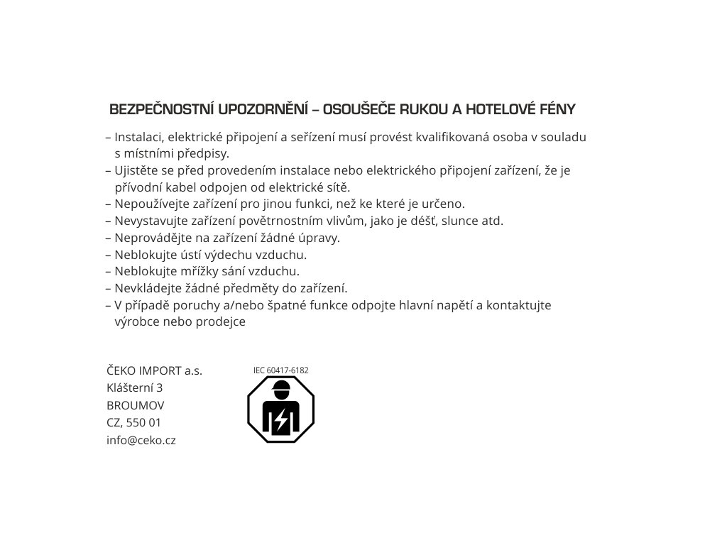 Bezkontaktní osoušeč: 230 V / 50 Hz, příkon 2.400 W / 10,4 A, IPX1, CLASS1, CE - Motor: příkon 200 W, 5.500 ot./min, s uhlíkovými kartáči - Topné těleso: příkon 2.200 W, termostat 65° C - Průtok vzduchu: 345 m3/h - Rychlost proudění vzduchu: 101 km/h - Úroveň hluku: 70 dB(A) v tolerančním pásmu +3 dB - Nastavitelná vzdálenost sepnutí senzoru: 10 – 30 cm - Průměrná doba vypnutí po oddálení rukou: 20 – 25 s - Bezpečnostní časový interval: 120 s (automatické vypnutí při nepřetržité aktivaci senzoru) - Výdechová tryska: otočná o 360°, pochromovaná zinková slitina - Kryt: ocel bíle lakovaná, tloušťka 2 mm - Ochrana krytu: 2 zámky, antivandal provedení - Hmotnost: 7 kg netto / 7,5 kg brutto - Rozměry: 278 mm × 243 mm × 213 mm (š × v × h)Doplňkové parametry