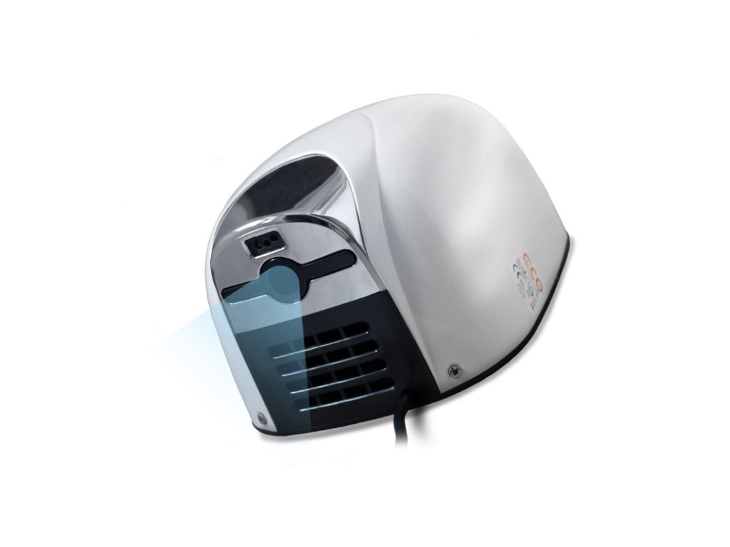 Revoluční bezkontaktní osoušeč rukou, spojující v sobě kompaktní velikost běžného osoušeče na zeď s výkonem tryskových osoušečů. Osouší silným proudem vzduchu ve tvaru paprsku. Úsporný provoz bez topného tělesa, výstupní vzduch se ohřeje na 50°C průchodem přes vysokoobrátkový motor. Osoušeč: 230 V / 50 Hz, příkon 1.100 W / 4,8 A, IP23, CLASS II, CE - Motor: příkon 1.100 W, 32.000 ot./min, - Průtok vzduchu: 345 m3/h - Rychlost proudění vzduchu: 325 km/h - Úroveň hluku: 75 dB(A) v tolerančním pásmu +3 dB - Kryt: Alu odlitek s bílým lakem - Antivandal - Hmotnost: 2,5 kg - Rozměry: 221 mm × 285 mm × 157 mm (š × v × h)Doplňkové parametry