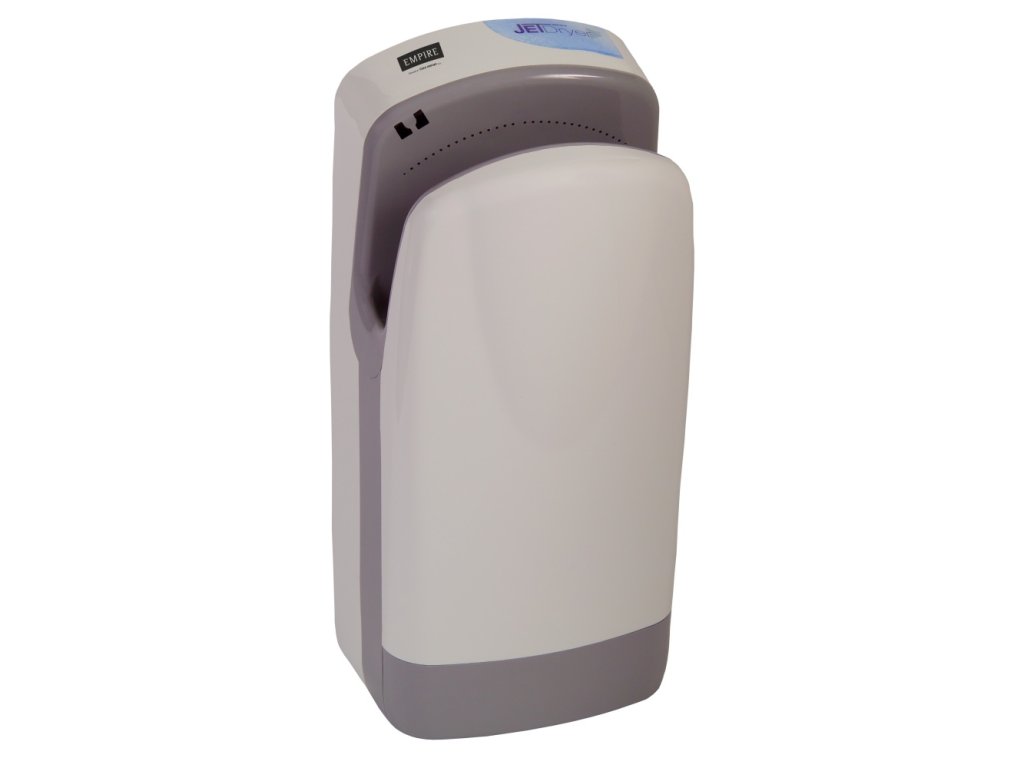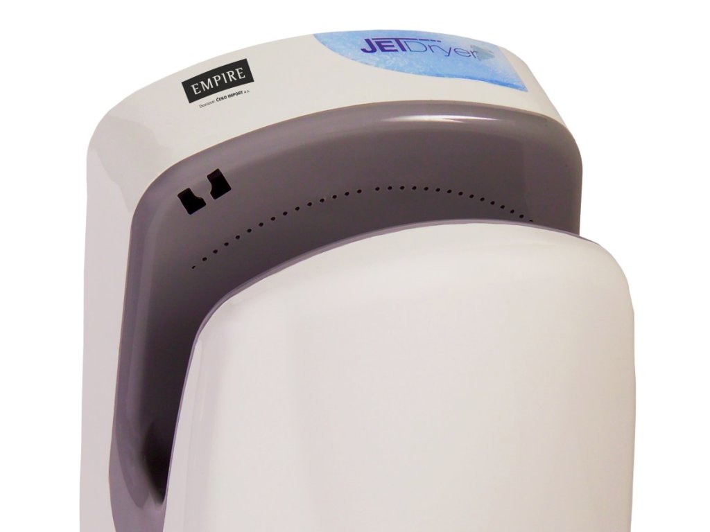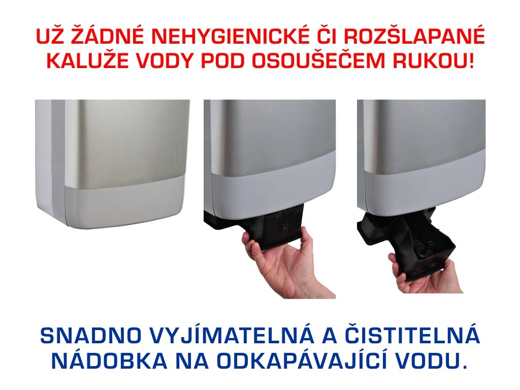 Bezkontaktní a hygienické osušení rukou za 12-15 s Šetří energii – příkon jen 1750 W Úspora až 80 % nákladů v porovnání s ručníky Automatické zapnutí při vložení rukou Odnímatelný zásobník na vodu pro suchou podlahu pod osoušečem (POZOR na osoušeče, které nemají odkapávací misku – voda stékající na podlahu představuje nepořádek a zhoršenou hygienu) Osoušeč: 220-240 V / 50-60 Hz, příkon 1.750 W, IP31, CLASS II, CE - Motor: 2 motory po 875 W, 32.000 ot./min, s uhlíkovými kartáči - Ohřev vzduchu: průchodem přes motory - Průtok vzduchu: 345 m3/h, resp. 95 l/s - Rychlost proudění vzduchu: 300 km/h (u ústí trysek) - Úroveň hluku: 70 dB(A) v tolerančním pásmu +3 dB - Průměrná doba vypnutí po oddálení rukou: 4 – 5 s - Kryt: odolný ABS plast, bílý - Hmotnost: 9,5 kg - Rozměry: 300 mm × 650 mm × 230 mm (š × v × h)Doplňkové parametry