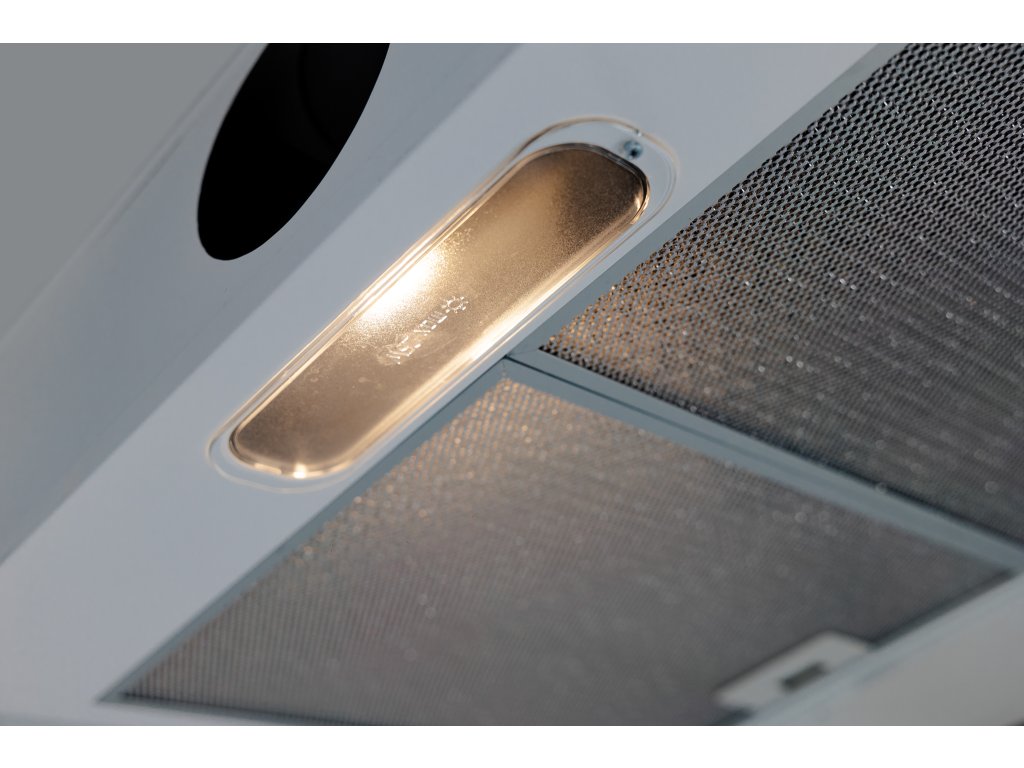Podskříňková digestoř, šíře 60 cm,bílá, max. výkon 160 m3/h (15 Pa), hlučnost Lw 50 – 61 dB(A), 3 rychlosti, mechanické tlačítkové ovládání, kovové sendvičové tukové filtry, které lze mýt v myčce, možnost práce v odtahovém i recirkulačním režimu, výstupní průměr 120 mm, osvětlení 1 × 4 W LED žárovka E14, Výbava: zdarma zpětná klapkaDoplňkové parametry