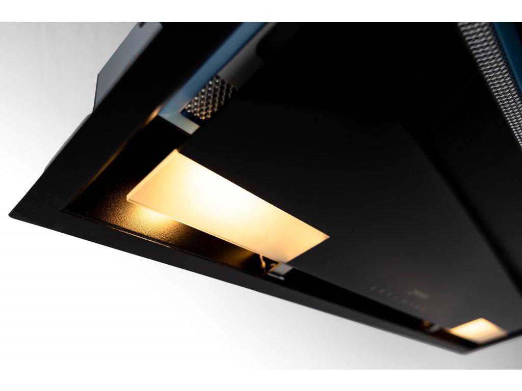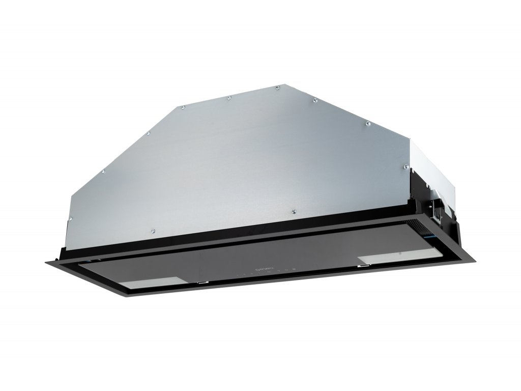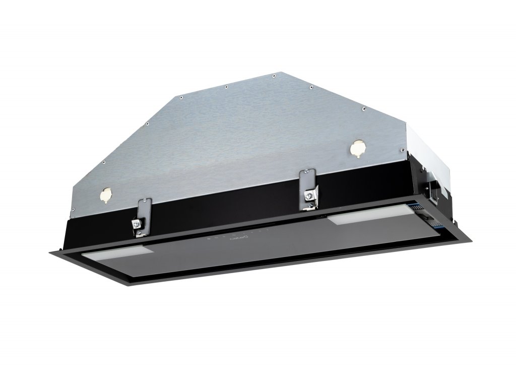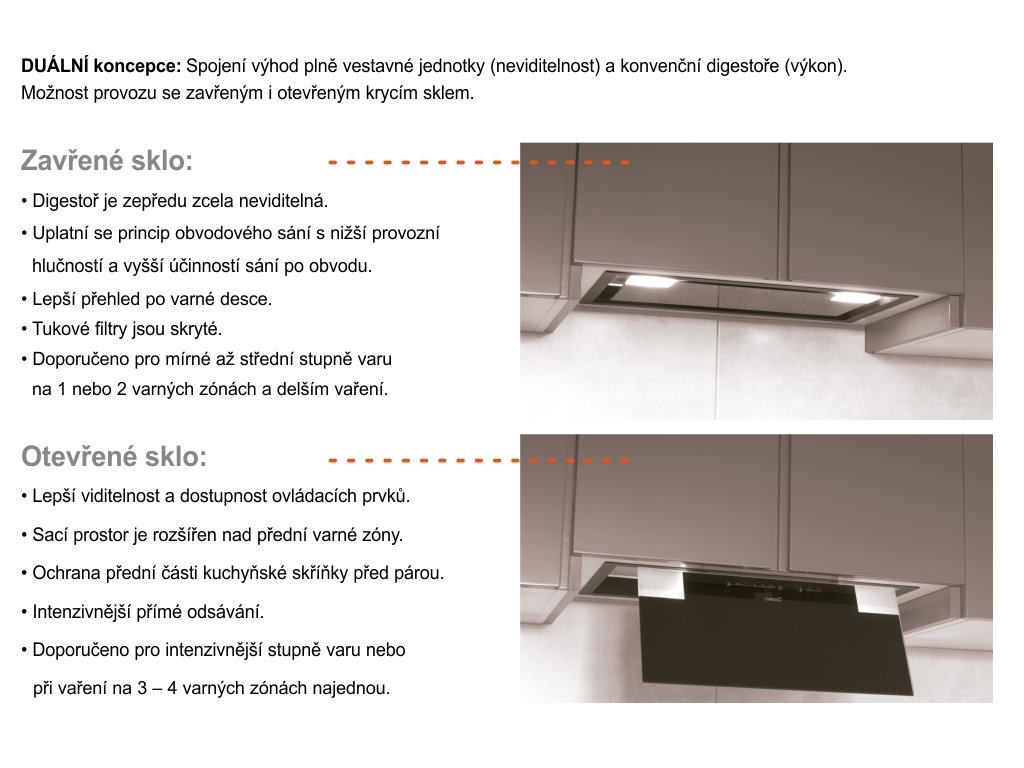 Neviditelná vestavná digestoř, 750 mm (pro 900 mm skříňku), nerez / černé sklo, přehledné a snadno přístupné dotykové (sensorové) ovládání na výklopném spodním panelu, 3 rychlosti, max. výkon 710 m³/h (5 Pa), hlučnost Lw 40 – 67 dB(A), max. tlak 450 Pa, 15 min. časovač, kovové sendvičové tukové filtry, které lze mýt v myčce, výstupní průměr 150 mm, možnost práce v odtahovém i recirkulačním režimu, snadná montáž, Výbava: úsporné LED osvětlení 2 × 4 W s nastavitelnou intenzitou jasu. Recirkulační režim u vestavných digestoří: Digestoř se osadí uhlíkovým pachovým filtrem. Přefiltrovaný vzduch se z digestoře odvádí obdobně jako u odtahového režimu trubkou, která prochází celou skříňkou. Tato trubka však neústí kolenem do zdi, ale nad skříňku, kde ji doporučujeme zakončit mřížkou. Pro výrobu skříňky je směrodatný rozměrový nákres a údaje v něm uvedené. Fotografie digestoří jsou ilustrační.Doplňkové parametry