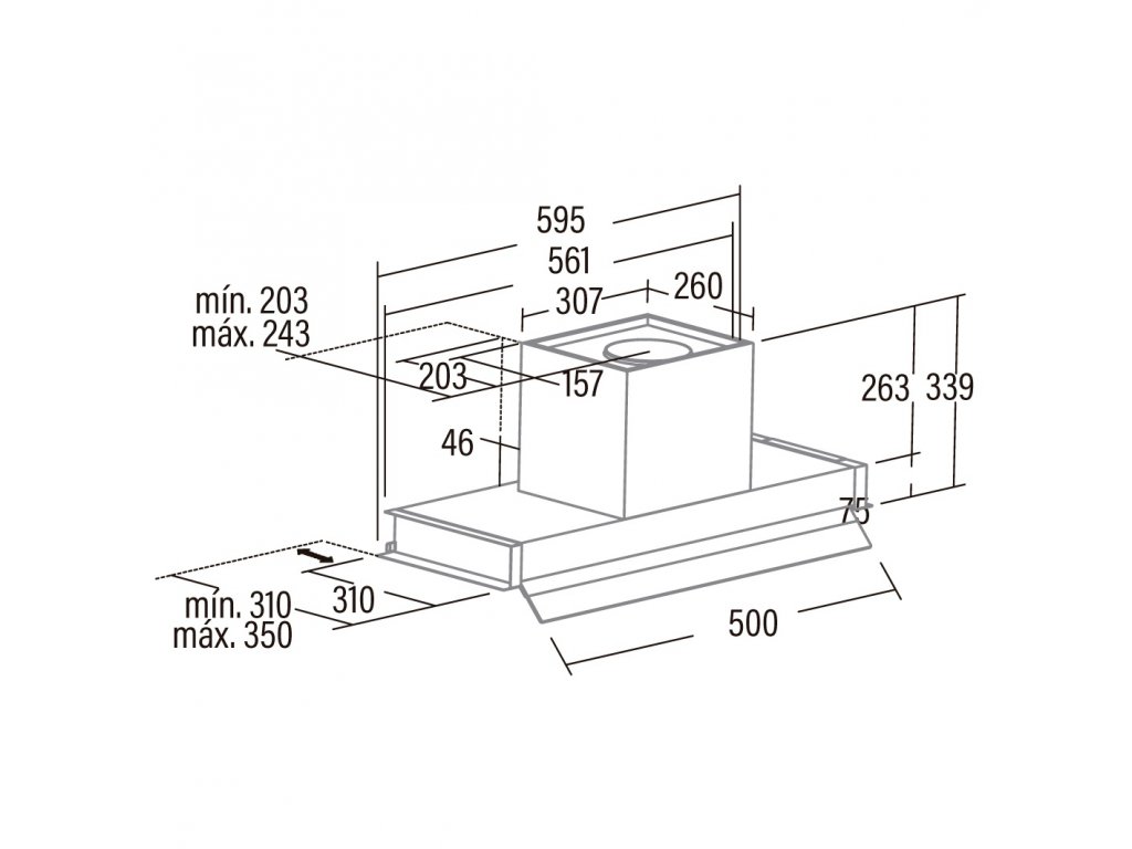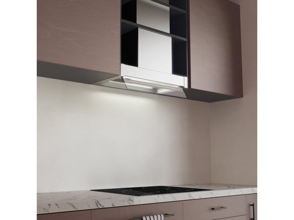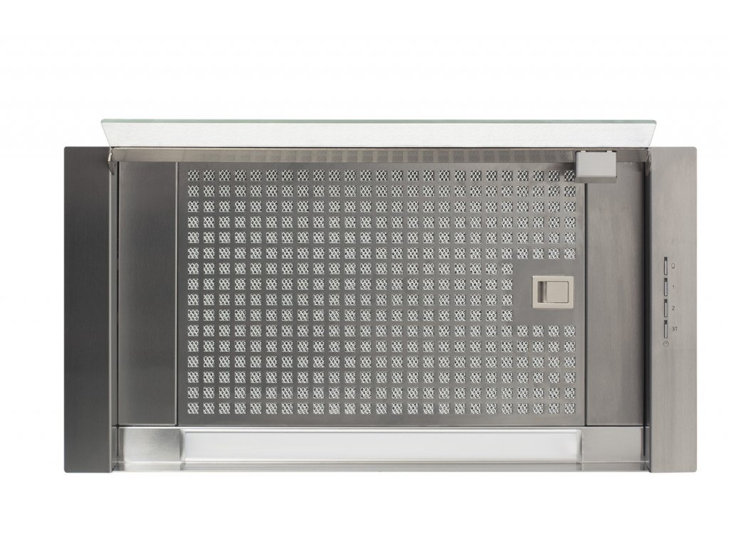 Neviditelná vestavná digestoř, 600 mm, nerez / sklo, elektronické ovládání VL3, 3 rychlosti (2 + Turbo), max. výkon 850 m³/h (5 Pa), hlučnost Lw 50 – 67 dB(A), max. tlak 470 Pa, 15 min. časovač, kovové sendvičové tukové filtry, které lze mýt v myčce, výstupní průměr 150 mm, možnost práce v odtahovém i recirkulačním režimu, snadná montáž, Výbava: osvětlení úsporným LED páskem 3,5 W, výklopné skleněné stínítko pro zvětšení plochy odsávání a pro ochranu dvířek skříňky. Recirkulační režim u vestavných digestoří: Digestoř se osadí uhlíkovým pachovým filtrem. Přefiltrovaný vzduch se z digestoře odvádí obdobně jako u odtahového režimu trubkou, která prochází celou skříňkou. Tato trubka však neústí kolenem do zdi, ale nad skříňku, kde ji doporučujeme zakončit mřížkou. Pro výrobu skříňky je směrodatný rozměrový nákres a údaje v něm uvedené. Fotografie digestoří jsou ilustrační.Doplňkové parametry
