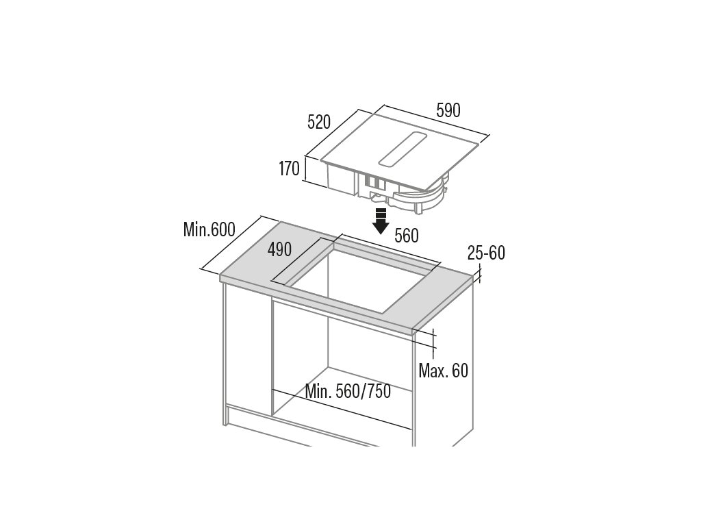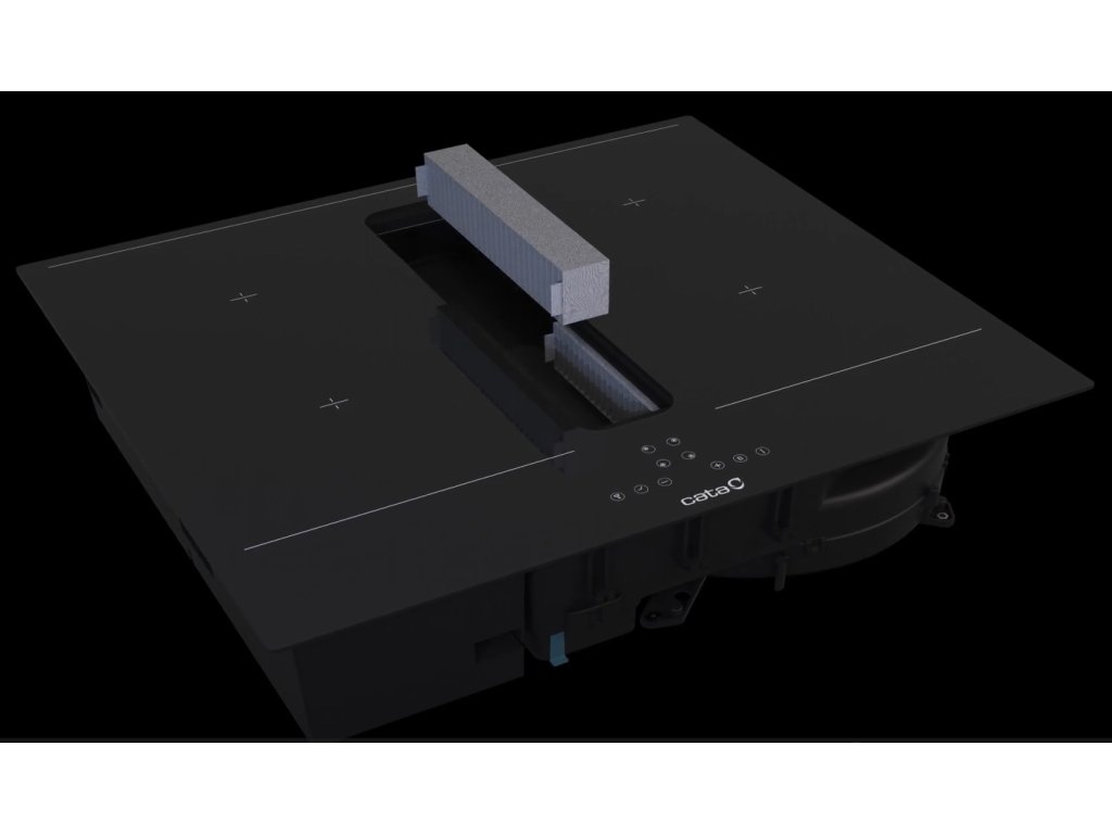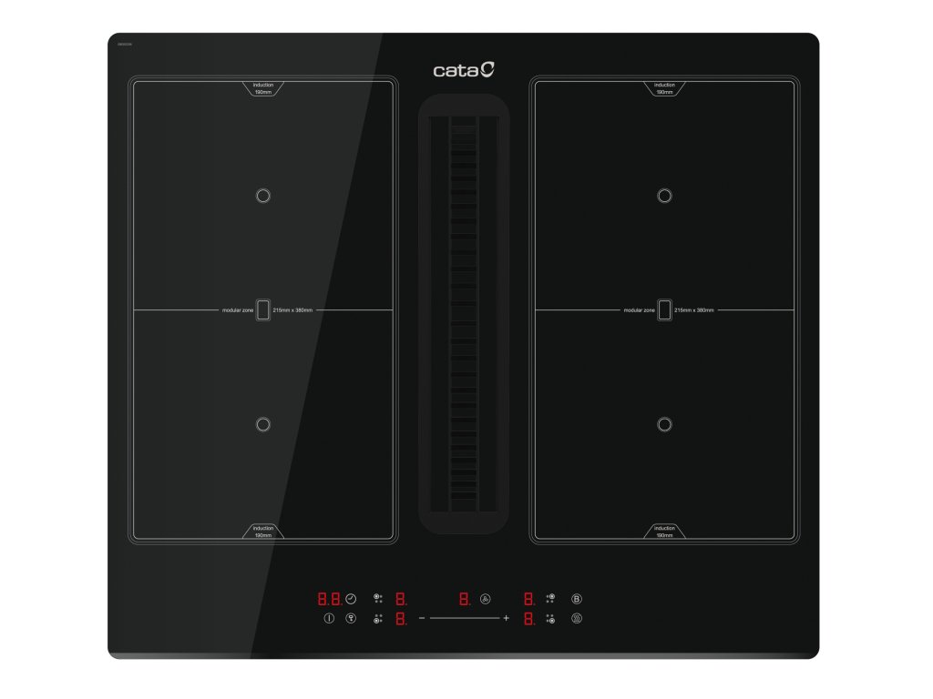 CATA IAS 6024 je špičková elektrická indukční varná deska s vestavěným odsavačem par, která kombinuje elegantní design s inovativními technologiemi pro moderní kuchyni. Klíčové vlastnosti: - Extrémně nízká – jen 17 cm (technologie FLOW-IN): Pod varnou deskou mohou být umístěné běžné kuchyňské zásuvky pro nádobí. - Intuitivní ovládání: Deska je vybavena senzorovým (dotykovým) ovládáním Mono Slider pro snadnou a přesnou regulaci. - Vysoký výkon: Celkový výkon 7,4 kW zajišťuje rychlé a efektivní vaření. - 4 varné zóny s funkcí BOOSTER: Všechny čtyři varné zóny disponují funkcí BOOSTER (rychlého ohřevu) pro okamžité dosažení požadované teploty. - Bezpečnostní prvky: Indikátor zbytkového tepla, dětská pojistka, pojistka proti přehřátí a automatické vypnutí se zvukovým signálem po 20 sekundách nečinnosti zajišťují maximální bezpečnost. - G4 indukční technologie: Powermanagement s možností nastavení pro různé typy zapojení a hodnoty jističů. Plynulé řízení výkonu. - Modulární (FLEX) indukční zóny: Možnost propojení varných zón pro vytvoření větších varných ploch (dvě zóny 215x190 mm nebo jedna zóna 215x380 mm na každé straně desky) poskytuje flexibilitu při vaření s velkými hrnci, pánvemi nebo grilovacími deskami. - Automatické funkce: Deska disponuje automatickou detekcí hrnců a funkcemi vaření, jako je rozmrazování, udržování teploty a vaření v páře. Časovače pro každou zónu. - Integrovaný odsavač par: S maximálním průtokem vzduchu 691 m³/h, dotykovým ovládáním s 5+1 TURBO nastaveními a nízkou hlučností v rozmezí 50 až 74 dB(A). Bezkartáčový motor zajišťuje tišší provoz, vyšší účinnost, přesné elektronické řízení, delší životnost a menší produkci tepla. Automatické řízení výkonu digestoře podle nastavených stupňů na jednotlivých varných zónách s možností přepnutí na manuální volbu výkonu. - Více možností odvodu par: Při recirkulačním provozu lze páry odvést dozadu skrz zadní stěnu skříňky do volného prostoru nebo skrz zadní prostor a prostor pod skříňkami dopředu ve spodní části skříňky nebo skrz zadní prostor do volného prostoru po bocích skříňky. Případně lze výdech digestoře připojit na odtahové potrubí. - Snadná údržba: Pro recirkulační provoz možnost volby základního jednorázového uhlíkového filtru s životností až 1 rok nebo vyjímatelných a regenerovatelnýché keramických voštinových filtrů (použitelné 3-5 let při pravidelné regeneraci). Regenerovatelné keramické filtry jsou dodávané zdarma s novým výrobkem. Snadno vyjímatelné kovové tukové filtry a omyvatelná nádržka na sběr tekutin obojí s možností mytí v myčce. Indukční deska 4 varné zóny: Pravá přední – rozměr 21,5 cm x 19 cm / 2,3 kW (Booster 3 kW) Pravá zadní – rozměr 21,5 cm x 19 cm / 2,2 kW (Booster 2,6 kW) Levá přední – rozměr 21,5 cm x 19 cm / 2,3 kW (Booster 3 kW) Levá zadní – rozměr 21,5 cm x 19 cm / 2,2 kW (Booster 2,6 kW) Možnost vytvoření 2 zdvojených zón o rozměrech 21,5 cm x 38 cm / 3,7 kW Dotykové ovládání s akustickou signalizací (Mono Slider) 9 nastavitelných úrovní výkonu + BOOSTER Funkce časovače pro každou zónu Funkce minutky Automatická detekce pánve Dětská pojistka Indikátor zbytkového tepla Automatické bezpečnostní vypnutí Přední zkosení (fazeta) Šíře 59 cm Odsavač par Dotykové ovládání s akustickou signalizací s funkcí časovače5 rychlostí + TURBO Sací výkon (dle UNE/EN 61591): 238 m3/h – 491 m3/h (Turbo 673 m3/h) Hlučnost (dle Reg.(EU) 65/2014): 51 dB(A) – 68 dB(A) (Turbo 74 dB(A)) Tichý bezkartáčový (BRUSHLESS) motor. Maximální příkon motoru 165 W Doběhový časovač Indikátor zanešení filtrů Snadná instalace Tukové filtry lze mýt v myčce Energetická třída A+Doplňkové parametry