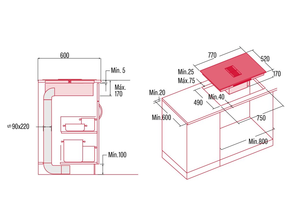 Indukční deska 4 varné zóny: Pravá přední – rozměr 21,5 cm x 19 cm / 2 kW (Booster 2,8 kW) Pravá zadní – rozměr 21,5 cm x 19 cm / 1,5 kW (Booster 2 kW) Levá přední – rozměr 21,5 cm x 19 cm / 2 kW (Booster 2,8 kW) Levá zadní – rozměr 21,5 cm x 19 cm / 1,5 kW (Booster 2 kW) Možnost vytvoření 2 zdvojených zón o rozměrech 21,5 cm x 38 cm / 3,7 kW Dotykové ovládání s akustickou signalizací 9 nastavitelných úrovní výkonu + BOOSTER Funkce časovače pro každou zónu Funkce minutky Automatická detekce pánve Dětská pojistka Indikátor zbytkového tepla Automatické bezpečnostní vypnutí Přední zkosení (fazeta) Šíře 77 cm Odsavač par Dotykové ovládání s akustickou signalizací s funkcí časovače a Touch Control Panel with timer and cleaning filters indicator 5 rychlostí + TURBO Sací výkon (dle UNE/EN 61591): 200 m3/h – 440 m3/h (Turbo 545 m3/h) Hlučnost (dle Reg.(EU) 65/2014): 45dB(A) – 64 dB(A) (Turbo 67 dB(A)) Tichý bezkartáčový (BRUSHLESS) motor. Maximální příkon motoru 130 W Doběhový časovač Indikátor zanešení filtrů Snadná instalace Tukové filtry lze mýt v myčce Energetická třída ADoplňkové parametry