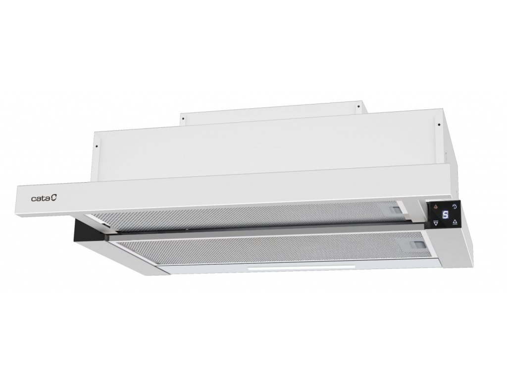 Bezkartáčový (brushless) motor CATA T1DC je konstruovaný tak, aby eliminoval v maximální míře vnitřní tření (tím, že neobsahuje uhlíkové kartáče) a tak dosahoval maximálních výkonů při nízké hlučnosti a nízké spotřebě elektrické energie. Zároveň tím, že nepoužívá uhlíkové kartáče a ty tak není potřeba pravidelně měnit, zvyšuje se životnost motoru a tím i celé digestoře. Vestavná výsuvná digestoř s bezkartáčovým motorem: šíře 600 mm, bílá, 1 motor T1DC 90 W, 5 rychlostí + TURBO, 575 m3/h (5 Pa), max. tlak 300 Pa, max. hlučnost Lw 63 dB. Recirkulační režim u vestavných digestoří: Digestoř se osadí uhlíkovým pachovým filtrem. Přefiltrovaný vzduch se z digestoře odvádí obdobně jako u odtahového režimu trubkou, která prochází celou skříňkou. Tato trubka však neústí kolenem do zdi, ale nad skříňku, kde ji doporučujeme zakončit mřížkou. Pro výrobu skříňky je směrodatný rozměrový nákres a údaje v něm uvedené. Fotografie digestoří jsou ilustrační.Doplňkové parametry