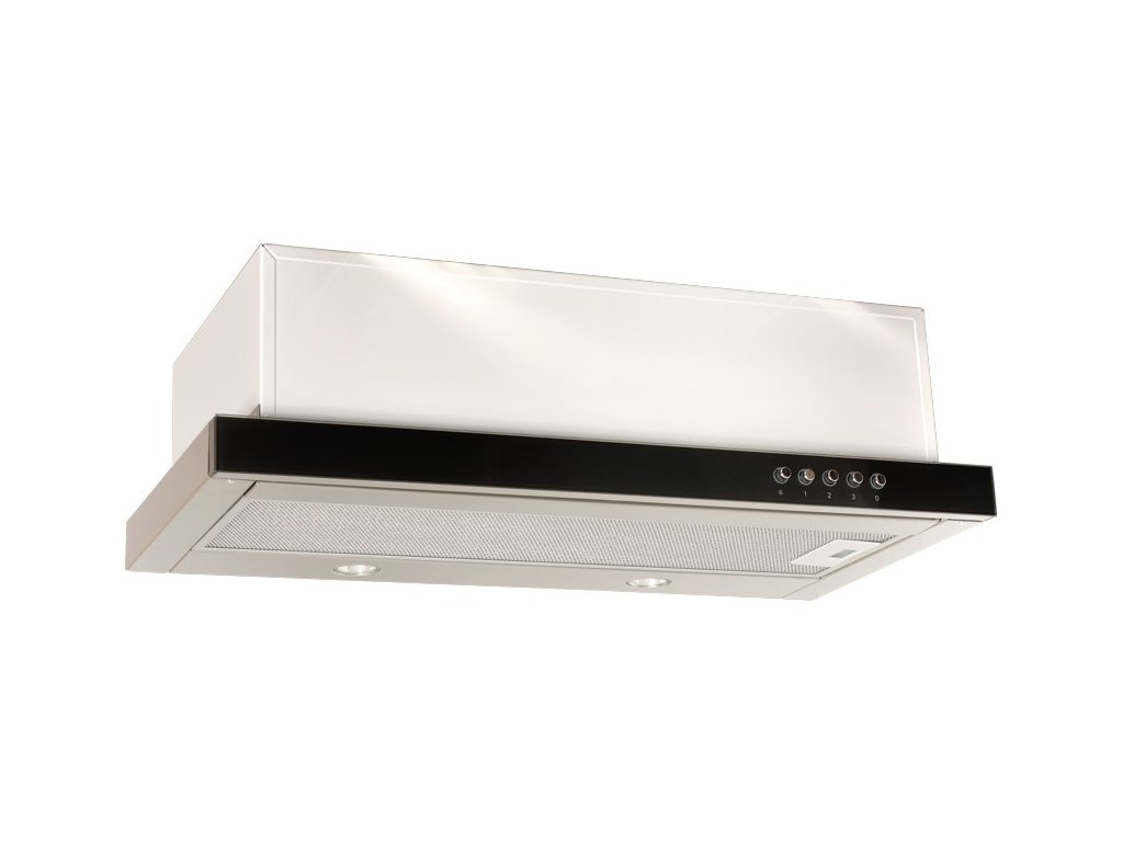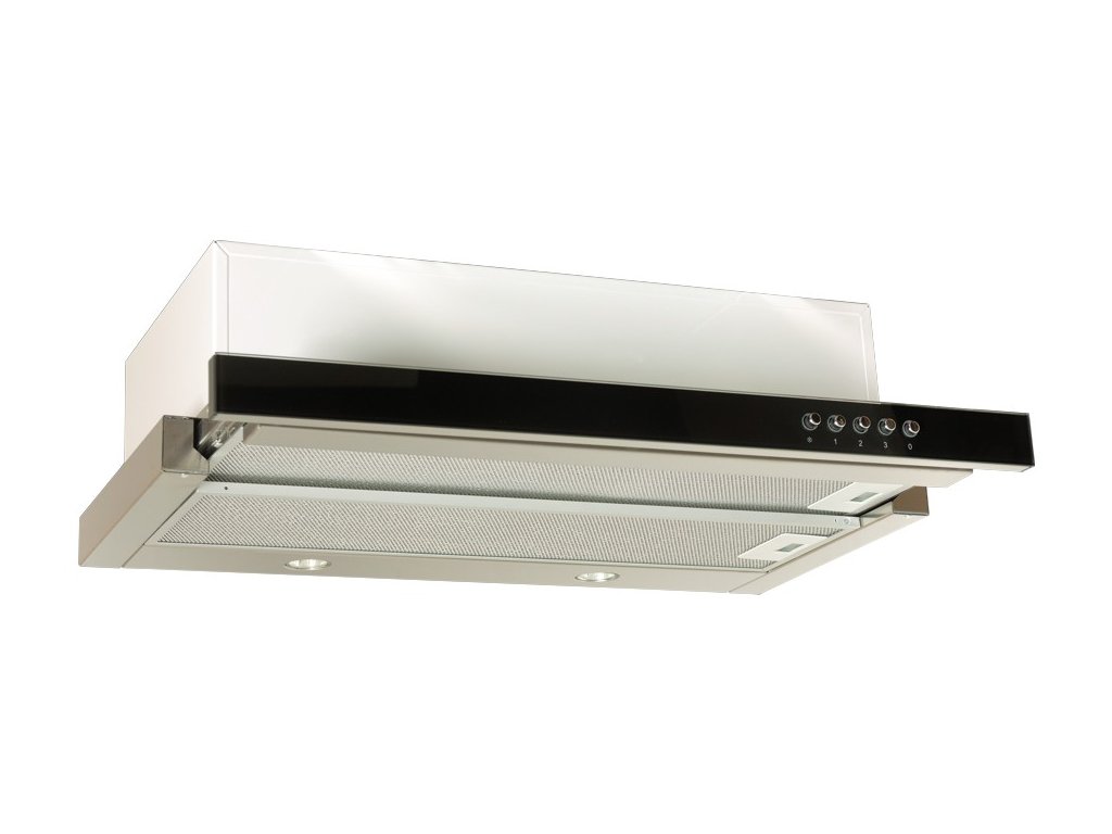 Vestavná výsuvná digestoř, šíře 60 cm, černá s černou skleněnou lištou, max. výkon 427 m³/h (15 Pa), hlučnost Lw 45 – 69 dB(A), 3 rychlosti, odsávací jednotky mají individuálně vyvažovanou turbínu, motory jsou opatřené vratnými tepelnými pojistkami (při přetížení motoru vypne, po jeho vychladnutí opět sepne), mechanické tlačítkové ovládání, kovové sendvičové tukové filtry, které lze mýt v myčce, možnost práce v odtahovém i recirkulačním režimu, výstupní průměr 150 mm, Výbava: úsporné LED osvětlení 2 × 2 W, zdarma redukce na 120 mm a zpětná klapka Recirkulační režim u vestavných digestoří: Digestoř se osadí uhlíkovým pachovým filtrem. Přefiltrovaný vzduch se z digestoře odvádí obdobně jako u odtahového režimu trubkou, která prochází celou skříňkou. Tato trubka však neústí kolenem do zdi, ale nad skříňku, kde ji doporučujeme zakončit mřížkou. Pro výrobu skříňky je směrodatný rozměrový nákres a údaje v něm uvedené. Fotografie digestoří jsou ilustrační.Doplňkové parametry