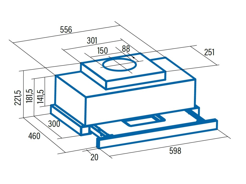 Bezkartáčový (brushless) motor CATA T1DC je konstruovaný tak, aby eliminoval v maximální míře vnitřní tření (tím, že neobsahuje uhlíkové kartáče) a tak dosahoval maximálních výkonů při nízké hlučnosti a nízké spotřebě elektrické energie. Zároveň tím, že nepoužívá uhlíkové kartáče a ty tak není potřeba pravidelně měnit, zvyšuje se životnost motoru a tím i celé digestoře. Vestavná výsuvná digestoř s bezkartáčovým motorem: šíře 600 mm, nerez lišta, 1 motor T1DC 90 W, 5 rychlostí + TURBO, 575 m3/h (5 Pa), max. tlak 300 Pa, max. hlučnost Lw 63 dB. Recirkulační režim u vestavných digestoří: Digestoř se osadí uhlíkovým pachovým filtrem. Přefiltrovaný vzduch se z digestoře odvádí obdobně jako u odtahového režimu trubkou, která prochází celou skříňkou. Tato trubka však neústí kolenem do zdi, ale nad skříňku, kde ji doporučujeme zakončit mřížkou. Pro výrobu skříňky je směrodatný rozměrový nákres a údaje v něm uvedené. Fotografie digestoří jsou ilustrační.Doplňkové parametry
