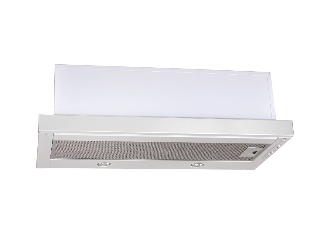Vestavná digestoř výsuvná, šíře 50 cm, bílá s bílou lištou, max. výkon 338 m3/h (15 Pa), hlučnost Lw 56 – 71 dB(A), 3 rychlosti, odsávací jednotky mají individuálně vyvažovanou turbínu, motory jsou opatřené vratnými tepelnými pojistkami (při přetížení motoru vypne, po jeho vychladnutí opět sepne), mechanické posuvné ovládání, kovové sendvičové tukové filtry, které lze mýt v myčce, možnost práce v odtahovém i recirkulačním režimu, Výbava: úsporné LED osvětlení 2 × 2 W, zdarma zpětná klapka Recirkulační režim u vestavných digestoří: Digestoř se osadí uhlíkovým pachovým filtrem. Přefiltrovaný vzduch se z digestoře odvádí obdobně jako u odtahového režimu trubkou, která prochází celou skříňkou. Tato trubka však neústí kolenem do zdi, ale nad skříňku, kde ji doporučujeme zakončit mřížkou. Pro výrobu skříňky je směrodatný rozměrový nákres a údaje v něm uvedené. Fotografie digestoří jsou ilustrační.Doplňkové parametry